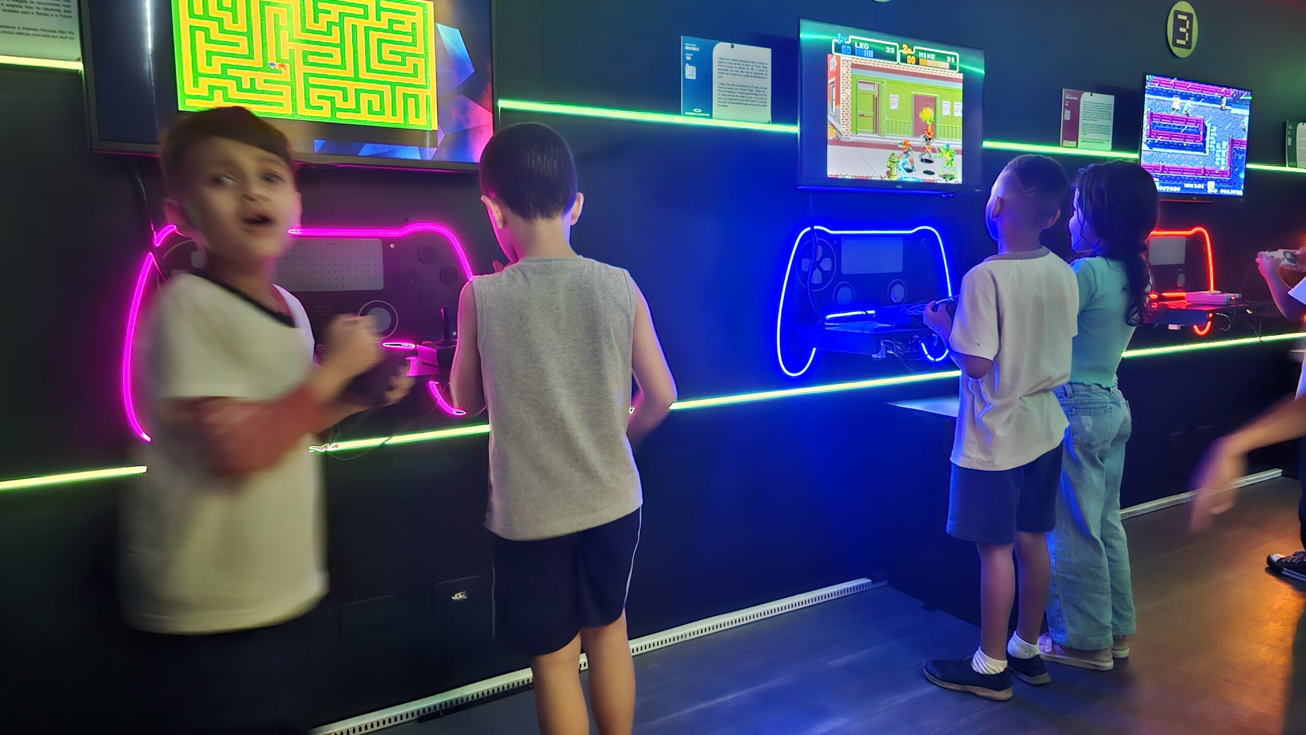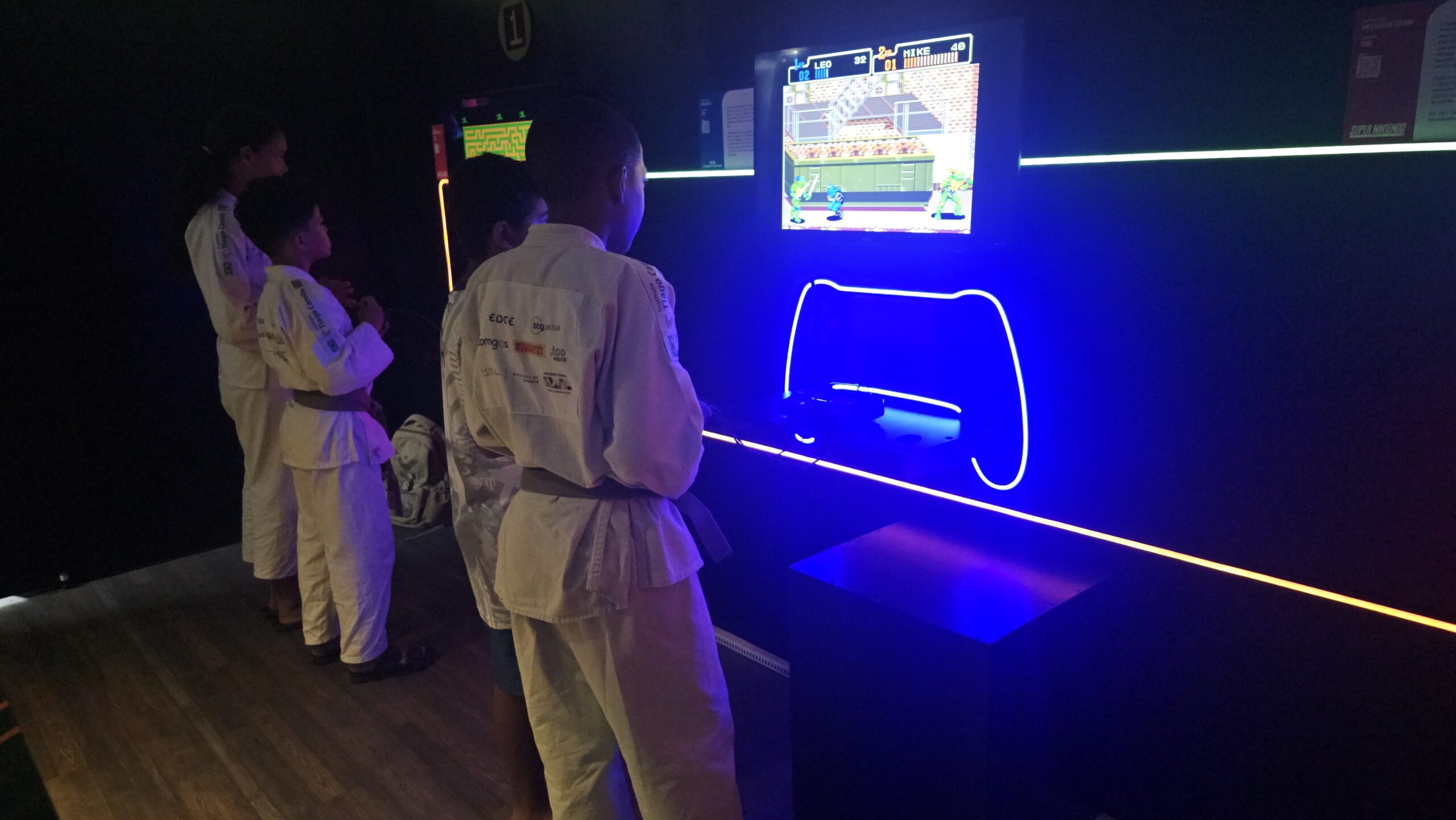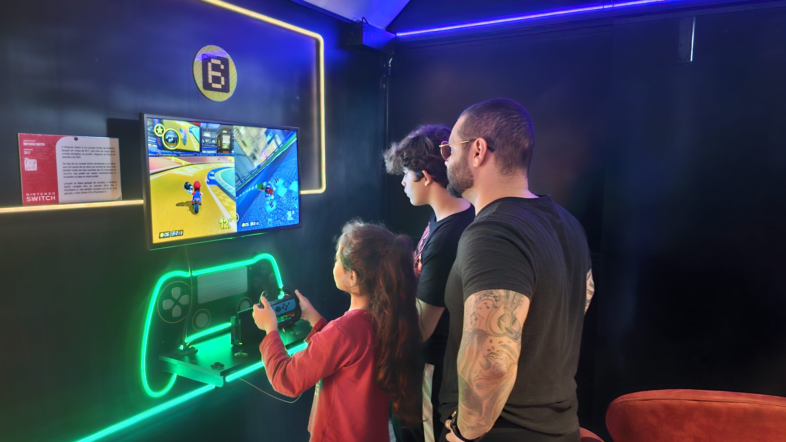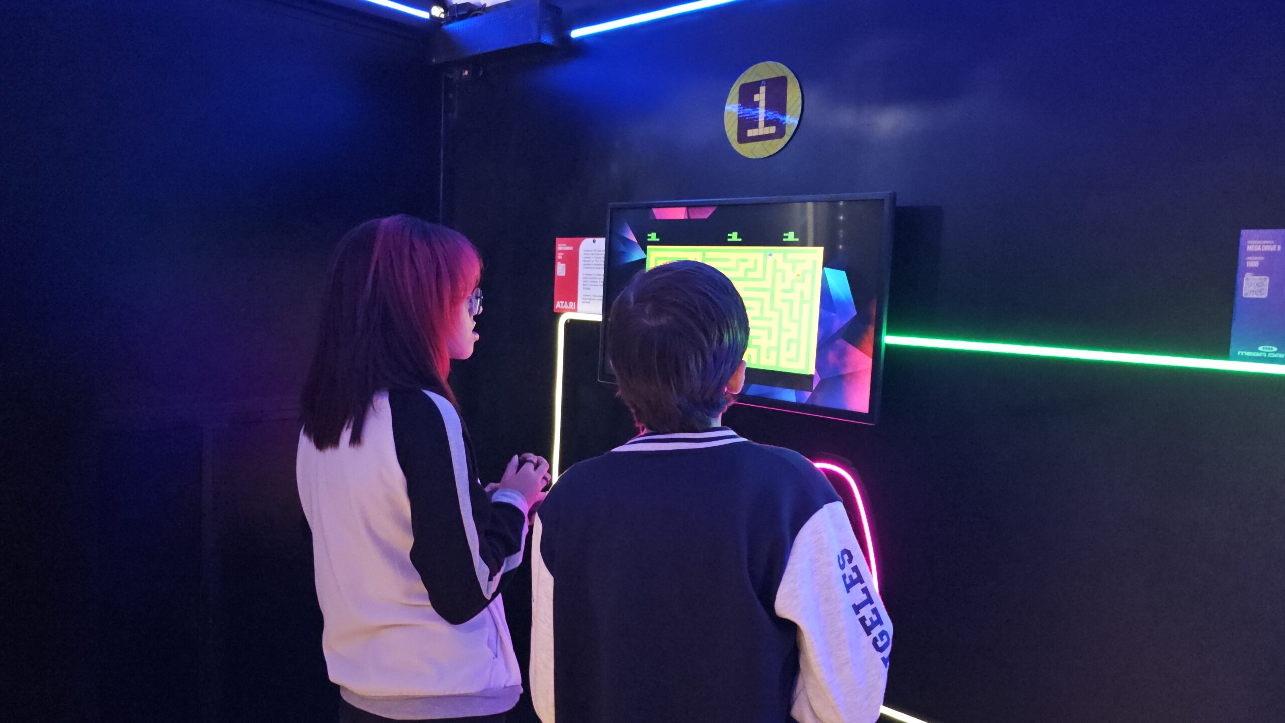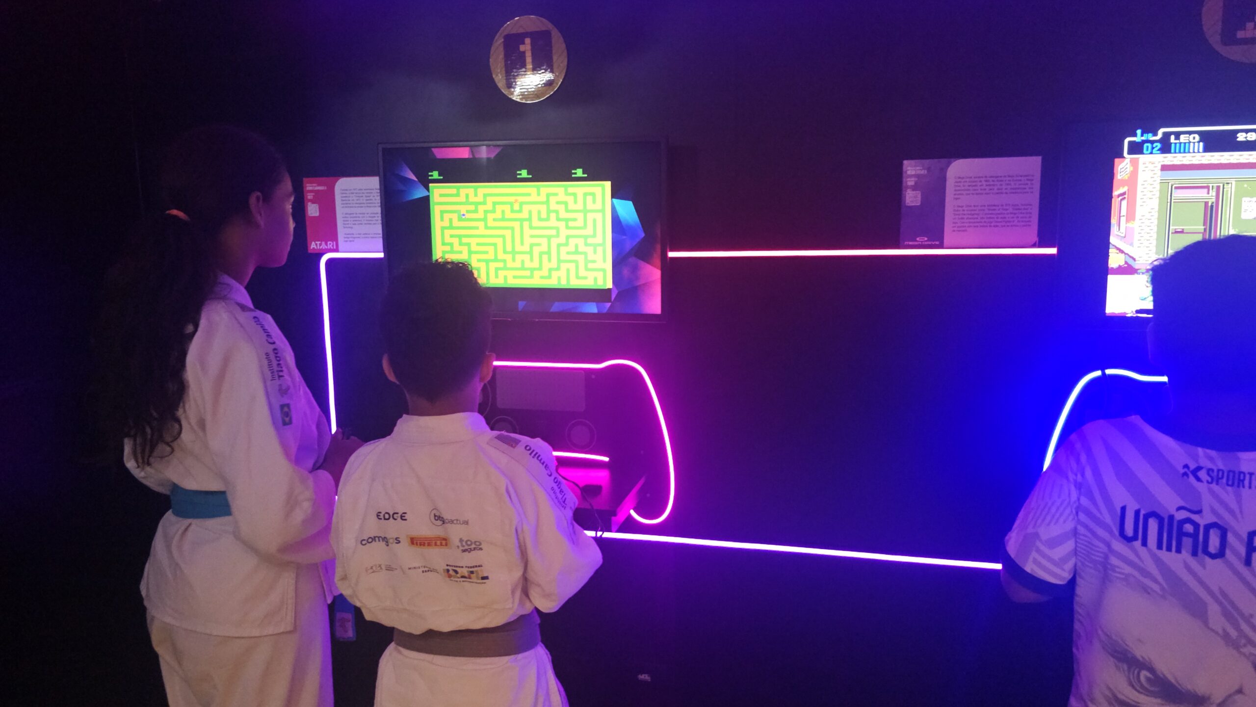 A exposição também é um jogo! Os visitantes fazem um circuito em duplas, experienciando games cooperativos e na modalidade versus, para curtir todos os diferentes tipos de jogos enquanto viajam de maneira interativa pela linha histórica dos videogames.